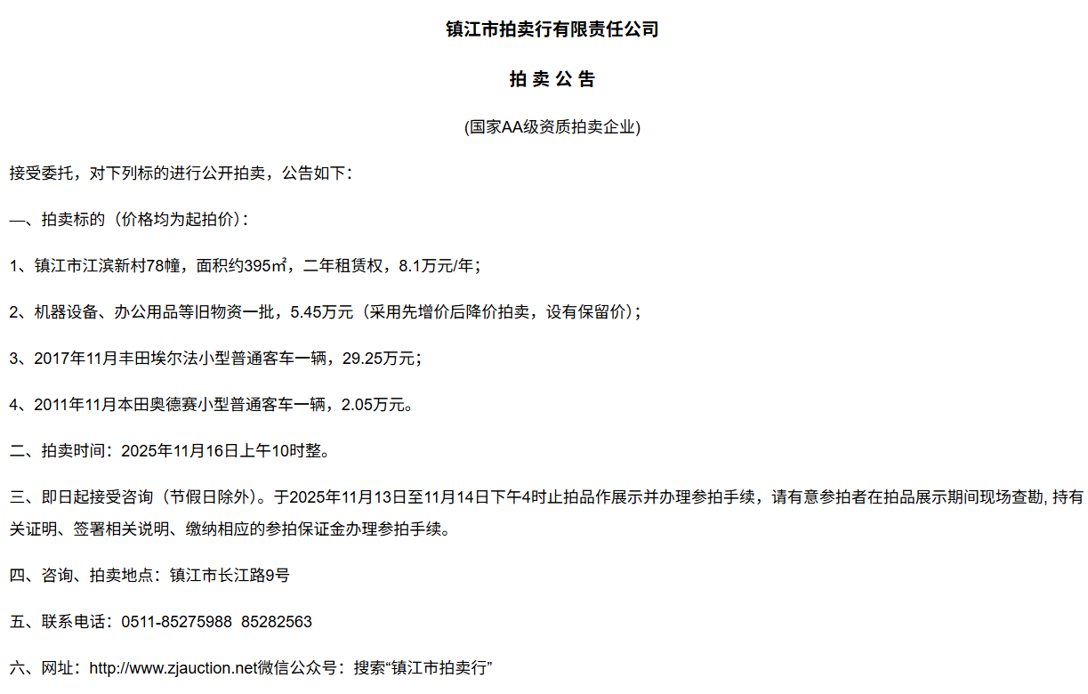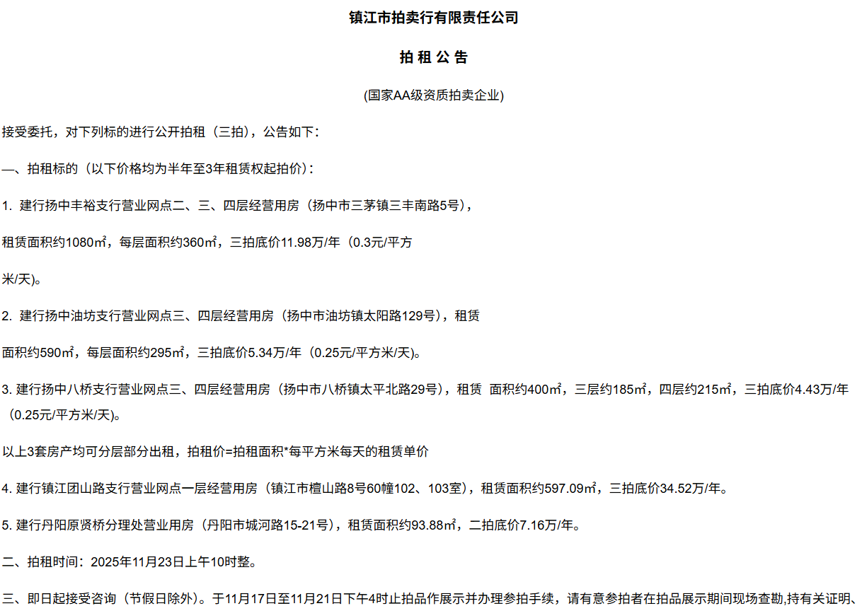 鎮江市拍賣行有限責任公司拍 租 公 吿(國家AA級資質拍賣企業)接受委托,對下列標的進行公開拍租(三拍),公告如下:—、拍租標的(以下價格均為半年至3年租賃權起拍價):1.  建行揚中豐裕支行營業網點二、三、四層經營用房(揚中市三茅鎮三豐南路5號),租賃面積約1080㎡,每層面積約360㎡,三拍底價11.98萬/年(0.3元/平方米/天)。2.  建行揚中油坊支行營業網點三、四層經營用房(揚中市油坊鎮太陽路129號),租賃面積約590㎡,每層面積約295㎡,三拍底價5.34萬/年(0.25元/平方米/天)。3. 建行揚中八橋支行營業網點三、四層經營用房(揚中市八橋鎮太平北路29號),租賃  面積約400㎡,三層約185㎡,四層約215㎡,三拍底價4.43萬/年(0.25元/平方米/天)。以上3套房產均可分層部分出租,拍租價=拍租面積*每平方米每天的租賃單價4. 建行鎮江團山路支行營業網點一層經營用房(鎮江市檀山路8號60幢102、103室),租賃面積約597.09㎡,三拍底價34.52萬/年。5. 建行丹陽原賢橋分理處營業用房(丹陽市城河路15-21號),租賃面積約93.88㎡,二拍底價7.16萬/年。二、拍租時間:2025年11月23日上午10時整。三、即日起接受咨詢(節假日除外)。于11月17日至11月21日下午4時止拍品作展示并辦理參拍手續,請有意參拍者在拍品展示期間現場查勘,持有關證明、簽署相關說明、繳納相應的參拍保證金辦理參拍手續。四、咨詢、拍租地點:鎮江市長江路9號五、聯系方式:0511-85275988   13655299933楊先生六、網址:http://www_zjauction_net.qo69z.cn;微信公眾號:搜索“鎮江市拍賣行” 拍品清單2025.11.23序號名稱起拍價(元)標的說明1建行揚中豐裕支行營業網點二、三、四層經營用房(揚中市三茅鎮三豐南路5號),租賃面積約1080㎡,每層面積約360㎡三拍底價11.98萬/年(0.3元/平方米/天)1、1-3號房產均可分層部分出租,拍租價=拍租面積*每平方米每天的租賃單價;2、意向競拍人在拍賣前需持營業執照或身份證與委托方說明租賃房產經營業態,確定意向后出具房產承租用途承諾書,經委托方審核后,方可交納保證金參加競拍;3、租賃期限為半年至3年(承租方與出租方協商而定),承租方每半年或一年結付租金,租賃期間的水、電費用及其它相關費用均由承租方承擔;4、承租方不得用于經營和保管危險物品,不得用于開設餐飲、娛樂等可能嚴重影響消防安全、運營安全的經營業態,不得用于經營委托貸款、小額貸款等可能冒用委托方名義,帶來聲譽風險的經營業態。租賃期內,承租方不得破壞墻體結構,自行成就消防、安全等使用條件,不得擅自將租賃房屋轉租、轉讓給他人使用,否則委托方有權收回房屋;5、拍租成交后,承租方將租金交至出租方指定賬戶,傭金交至拍賣方賬戶(拍租傭金為該房屋一個月租金)。承租方憑租賃合同無息退還保證金。2建行揚中油坊支行營業網點三、四層經營用房(揚中市油坊鎮太陽路129號),租賃面積約590㎡,每層面積約295㎡三拍底價5.34萬/年(0.25元/平方米/天)3建行揚中八橋支行營業網點三、四層經營用房(揚中市八橋鎮太平北路29號),租賃面積約490㎡,每層面積約245㎡三拍底價4.43萬/年(0.25元/平方米/天)4建行鎮江團山路支行營業網點一層經營用房(鎮江市檀山路8號60幢102、103室),建筑面積約597.09㎡三拍底價34.52萬/年5建行丹陽原賢橋分理處營業用房(丹陽市城河路15-21號),建筑面積約93.88㎡二拍底價7.16萬/年